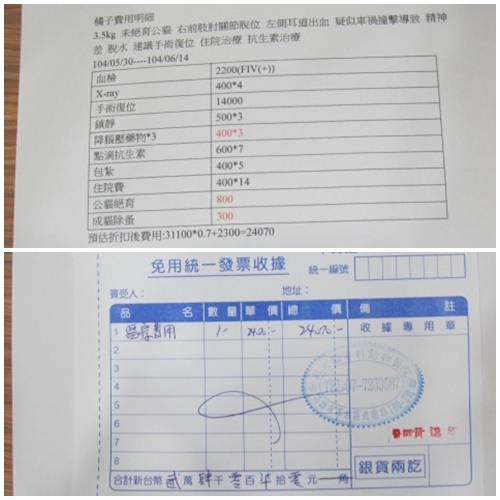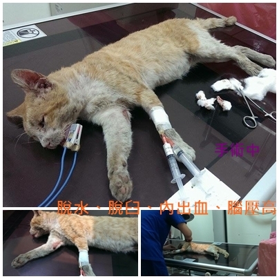 主題: 高雄車禍脫水橘子水溝貓 申請者姓名: Kevina Lin 花色: 申請日期: 2015-06-24 17:08:25 申請者部落格: 無 申請者臉書網址: https://www.facebook.com/kevinalolz 所在縣市/合作醫院: 高雄市/恩澤動物醫院 治療費用: 24070元 需求人數: 27人 已結案 (2022-04-14 17:48:28) 報名人員: 張恩綺(已付款)、LovelyBaby(已付款)、Ping Hussard(已付款)、長春路四面佛(已付款)、Eddy(已付款)、Abby Yu(已付款)、Artemis Kuo(已付款)、Jessie(已付款)、蘇洛克(已付款)、Hsiny Zhang、佳穎敏菱(已付款)、林俞彤、林小豬 x2(已付款)、george x3(已付款)、JIA CHYI(已付款)、李 其展(已付款)、Kero Yen(已付款)、Chichi Liu(已付款)、小華 x2(已付款)、Teresa Hsieh(已付款)、徐崇靜(已付款)、imlosting(已付款)、Jillfly(已付款)、古拉(已付款)、優美膚(已付款)、 候補人員: 動物病情說明: 小橘貓遭貨車從腳和脖子輾過,