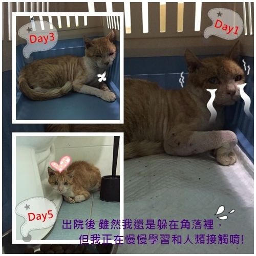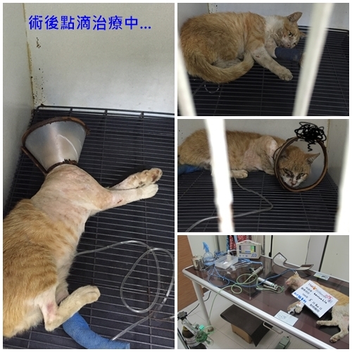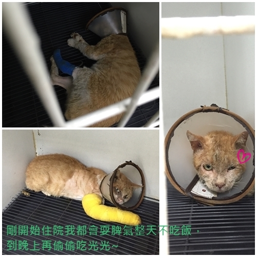 但後來開刀幾天後就出院囉!動物近況說明: 目前貓咪食慾還算不錯,但是前腳脫臼處還無法正常走路(還有點一拐一拐的),所以先在家中安置,後續若親人的話會送養;如果還是不親人的話會等到腳傷完全恢復、能夠適應戶外生活後再原地放養,並定時提供新鮮的食物與乾淨的水。