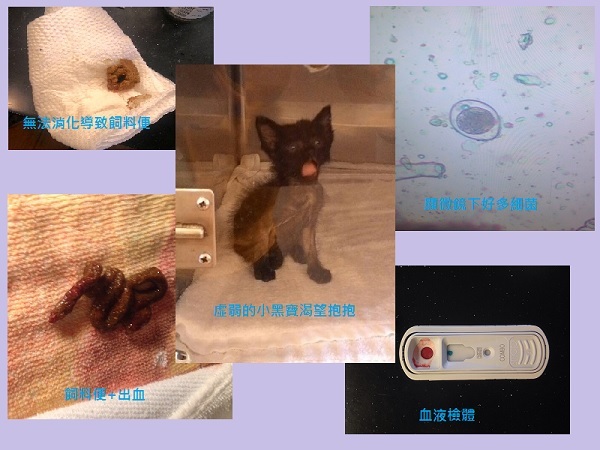 主題: 拉肚子血便的小黑寶 申請者姓名: Yo YoCat 花色: 申請日期: 2015-06-30 11:11:22 申請者部落格: 申請者臉書網址: https://www.facebook.com/yocat.yo 所在縣市/合作醫院: 高雄市/弘恩動物醫院 治療費用: 9800元 需求人數: 11人 已結案 (2022-04-14 17:48:24) 報名人員: Coffeemilk(已付款)、李凱特(已付款)、sonwing(已付款)、zining(已付款)、Windy(已付款)、Anq Liao、Anq Liao(已付款)、FS.NG x2(已付款)、lavinia x2(已付款)、iamdavidga(已付款)、 候補人員: 動物病情說明: 小黑寶是協會志工來執行大寮區結紮專案前一天被丟棄在我家門口的幼貓,因此由我暫時收容牠並和鄰居王小姐輪流照顧。小黑寶由我們收容後,我們有餵牠奶粉、飼料及幼貓罐。星期天時牠出現一直拉肚子現象,而且伴有血便,也有脫肛現象,恰好協會志工梁仕宏大哥載運結紮公貓回來,為確保小黑寶的健康,我們於是請梁先生先把小黑寶送醫治療。