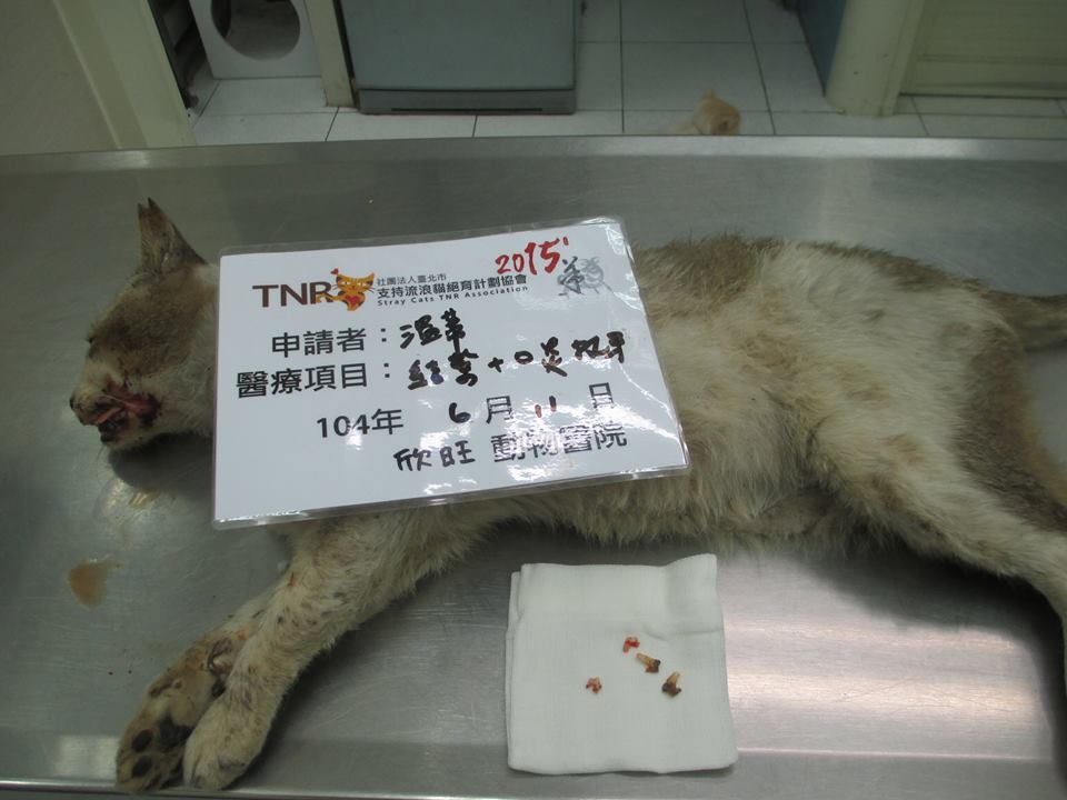 主題: 嚴重口炎,爛舌頭,吞嚥痛苦的公貓 申請者姓名: 楊溫蒂 花色: 申請日期: 2015-07-03 13:07:00 申請者部落格: 申請者臉書網址: 所在縣市/合作醫院: 台北市/欣旺動物醫院 治療費用: 8600元 需求人數: 10人 已結案 (2019-07-11 13:21:39) 報名人員: ERic YU(已付款)、K(已付款)、didolan(已付款)、HU(已付款)、涂育瑄(已付款)、liglig(已付款)、惠青(已付款)、Joba Huang(已付款)、Emily Chou(已付款)、Rosalind Tsai(已付款)、 候補人員: 動物病情說明: 在基隆老家周邊實施TNR維護行動時,發現這大公貓~嚴重口炎又流很惡臭的口水,全身也是髒兮兮看似無法自理清潔毛髮的落魄樣子,嚴判是標準的口炎現象導致牙齦紅腫痛也牙痛爛舌頭造成吞嚥痛苦~ 動物近況說明: 住院其間我都常去看看他.拔牙和結紮手術後恢復狀況良好~大吃大喝樣很舒展還會舔理毛髮,胸前領口處已經自理乾淨.已出院放回原生地
