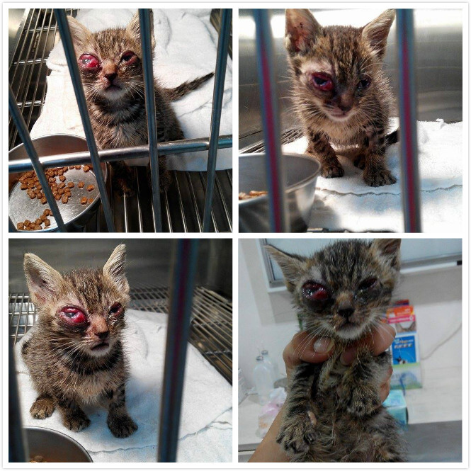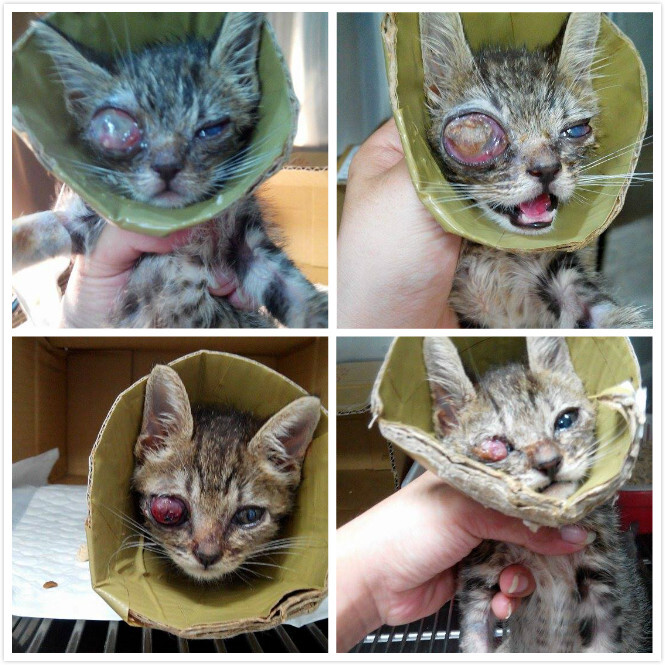 小小虎因為在外流浪時~因為有上呼吸道的問題~又結膜炎~角膜炎~葡萄膜炎~造成眼睛腫大~眼壓過高~現在眼睛壞死~未來必須眼球摘除~