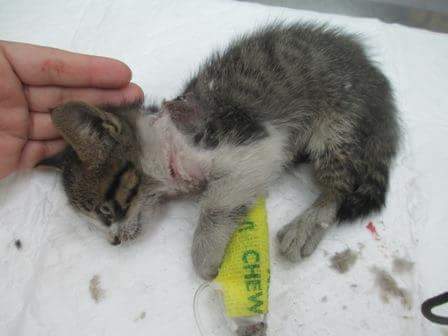小貓後腳、肩胛骨跟脊椎,似乎都有骨折跡象。