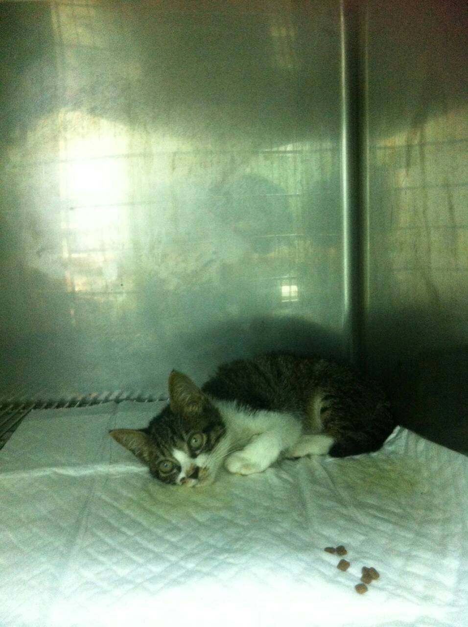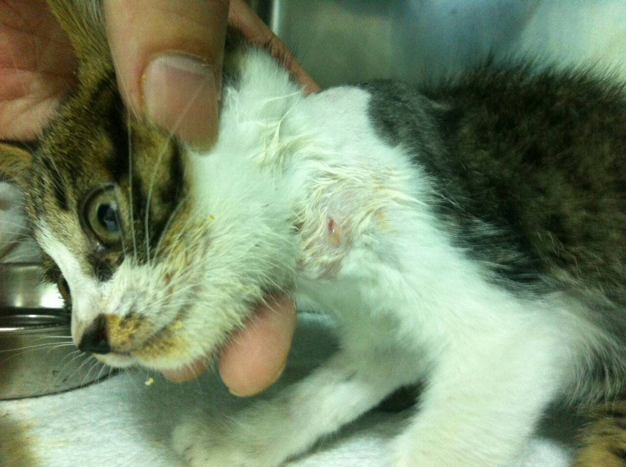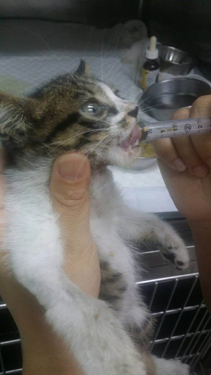 在大馬路邊停的車子下,一隻奄奄一息、身上破洞又髒兮兮的小貓,緊急將小貓送到欣旺動物醫院。