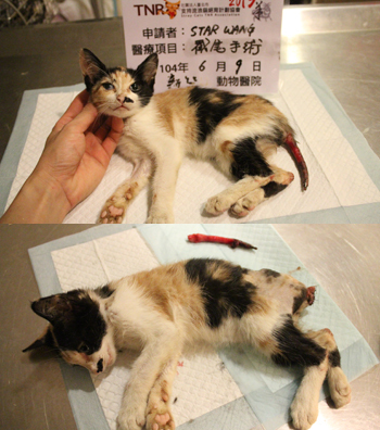 主題: 竹南收容所爛尾小花貓 申請者姓名: Star Wang 花色: 申請日期: 2015-07-02 21:58:03 申請者部落格: 申請者臉書網址: 所在縣市/合作醫院: 新竹市/新竺動物醫院 治療費用: 7000元 需求人數: 8人 已結案 (2022-04-14 17:47:59) 報名人員: Moon(已付款)、陳吉寶(已付款)、Yi-hsuan Liu(已付款)、Monica Wang(已付款)、alicelin x2(已付款)、Bonnie Lee(已付款)、詹雅如(已付款)、 候補人員: 動物病情說明: 20150608接到竹南收容所電話有五隻未開眼奶貓,