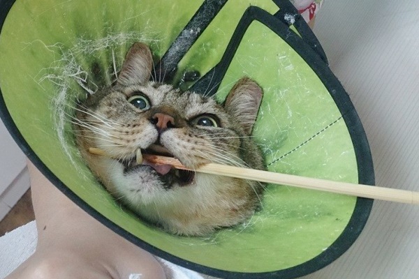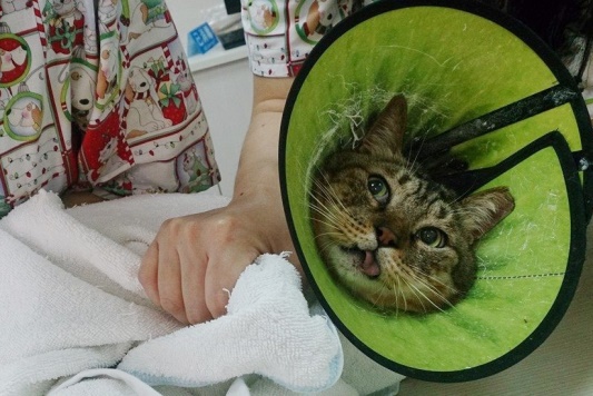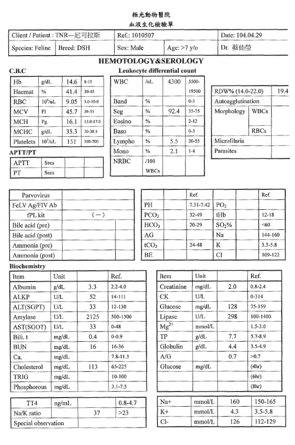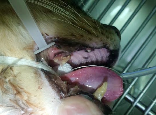 診斷為口炎,建議治療先使用口樂噴灑,若效果不佳則使用拿賽可得,如果仍有嚴重流口水,則需口服類固醇治療。治療觀察兩個月,回診發現體重又往下掉了一公斤到6.63公斤,口腔發炎已經嚴重影響到進食,醫師建議要進行全口拔牙,6/23住院,隔日進行洗牙拔牙,術後尼董清醒得很快,果然身體建康,目前已帶回安養之家照顧,當晚很"勉強"的吃完一個罐頭,還請各位幫忙尼董的醫療費用...別讓尼董不開心。