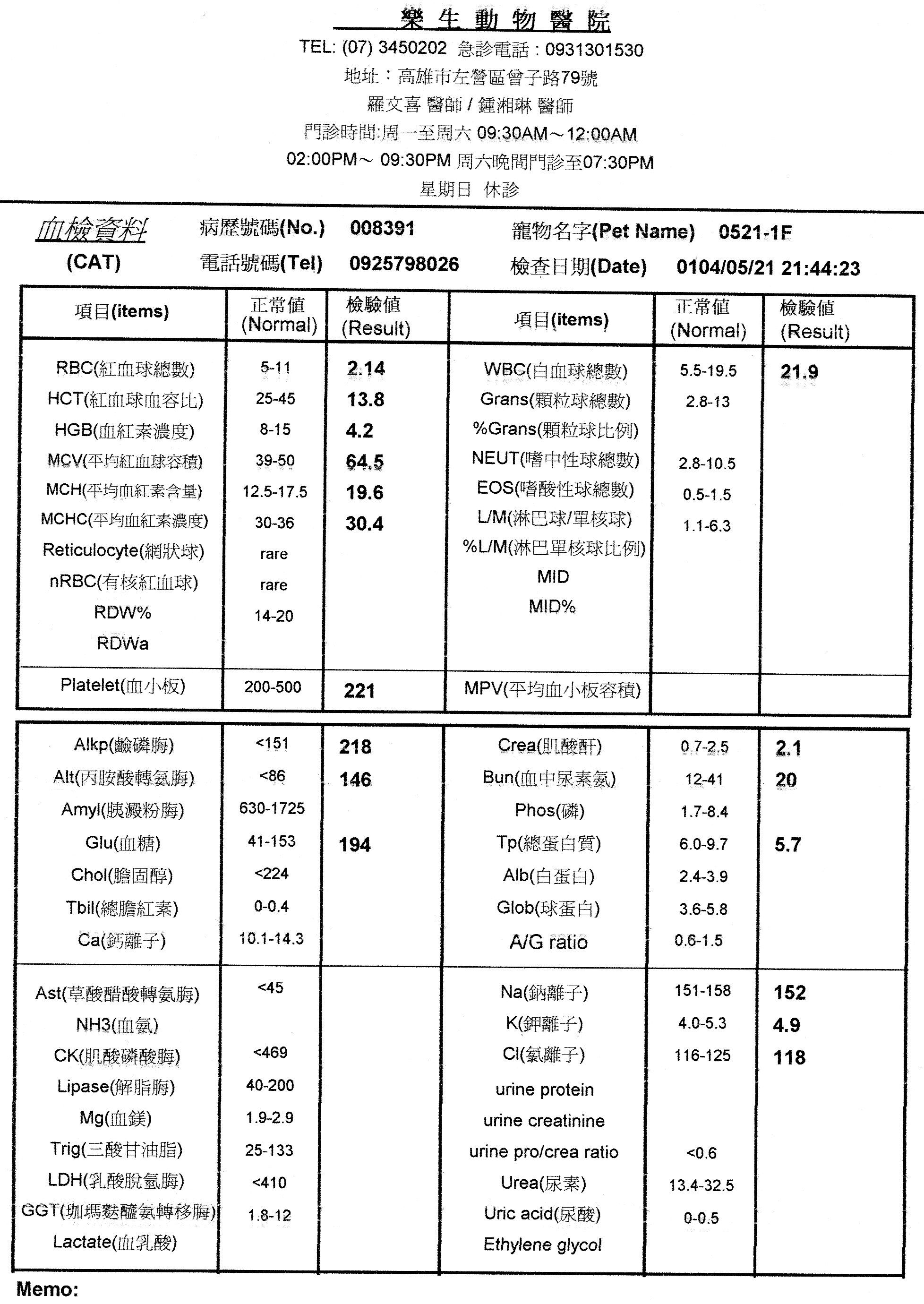紅血球過低(貧血,有可能出血導致),肝指數亦有偏高(可能撞擊造成的傷害),
