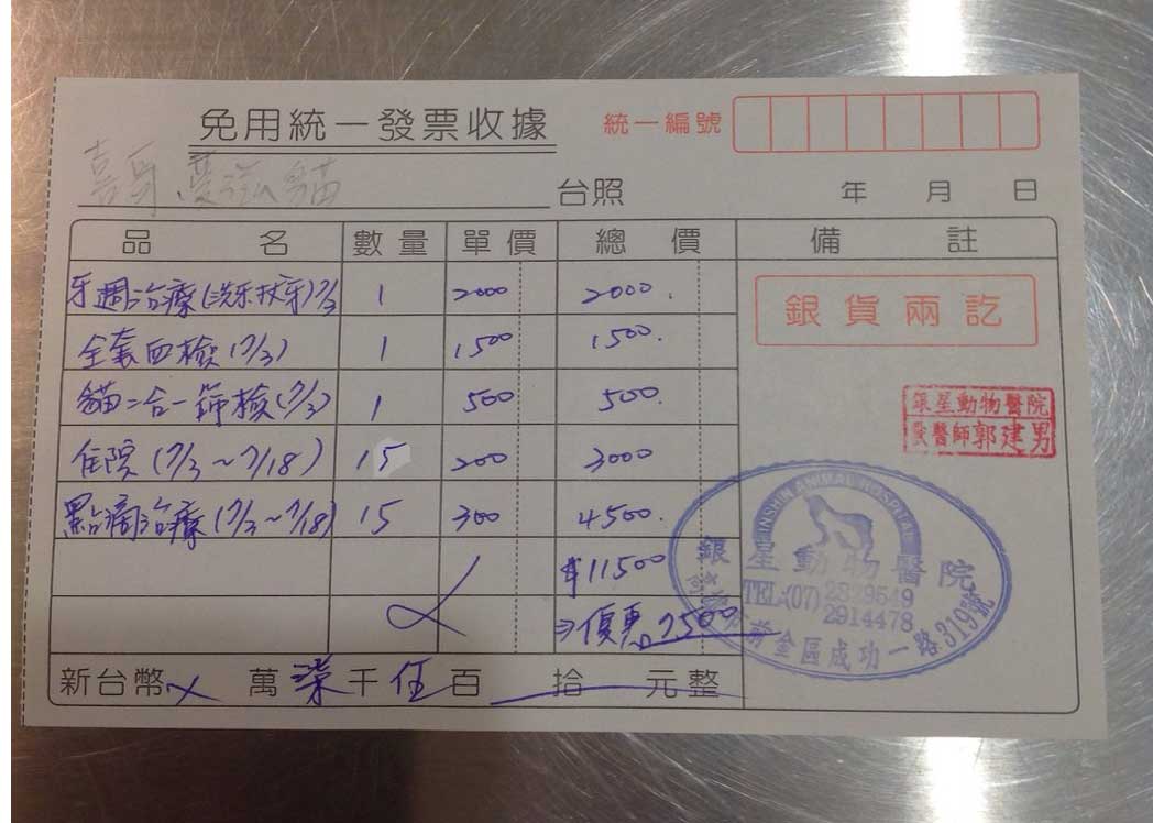 本次喜哥的醫療費用為$11500,但住院期間都是由秀雲姐準備喜哥的飯飯,一些也照護的工作也是由秀雲姐協助完成,所以院方特別在費用給折扣,折扣後為$7500;希望各位朋友們可以幫忙喜哥的醫藥費!!!動物近況說明: 目前喜哥已於7/18出院回到喵喵茶療養,也可以進食!!(短時間內喜哥都不會放回原地而是在喵喵茶療養)