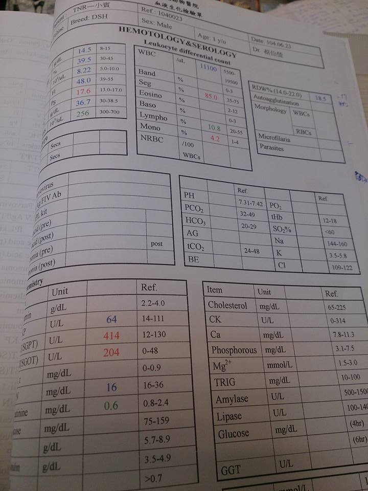 主題: 過敏性腸炎的小賓 申請者姓名: 臺北市支持流浪貓絕育計劃協會 花色: 申請日期: 2015-07-07 17:18:16 申請者部落格: 申請者臉書網址: 所在縣市/合作醫院: 台北市/極光動物醫院 治療費用: 6030元 需求人數: 7人 已結案 (2022-05-13 15:06:08) 報名人員: ying(已付款)、nelson x2(已付款)、yuan(已付款)、Lawrence x2(已付款)、廖小惠(已付款)、 候補人員: 動物病情說明: 小賓生活在小吃店後巷的排油煙機附近,被志工發現時正吃喝著小吃店排出油膩膩的水和地上留下的食物殘渣 ,小小的身軀瘦弱還卡著油汙,觀察了兩天都沒有發現母貓出現,小賓都是單獨行動,平常就睡在小吃店堆在巷子裡的雜物下 ,志工撈起後發現小賓非常親人,連在吃罐罐時也很愛講話,體內外驅蟲、預防針施打後小賓的狀況都十分良好,是個活潑愛說話的孩子,在等待幸福中,約四個月齡時,小賓卻開始水便食慾不振、伴隨嘔吐,原以為是一般的腸胃不適,吃藥兩三周幾乎沒有改善,進一步血檢查發現肝指數、白血球過高,有感染的狀況,但年紀輕輕有有肝病的可能性較低,醫師覺得小賓尚幼有可能是肝臟發育未完全,也許長大會慢慢改善,或是年紀越長狀況會越明顯,有可能是以下三種疾病:1.過敏性腸炎,自體免疫所引起的發炎性疾病、2.肝門脈分流、3.冠狀病毒,經過一連串的檢查,自體免疫疾病與抗核抗體(ANA)已確定小賓的免疫系統將自已身體的物質視為外來物,而引發抗原抗體的免疫反應,導致組織傷害,進一步送驗62樣過敏原,發現小賓對塵璊、皮屑、鯖魚、鱈魚、花生、米、玉米等過敏,食物中若還有這些成份會導致過敏性腸炎,會腹瀉嘔吐發炎,在食物攝取上必須要非常小心,在大家細細的照顧下,小賓已經在白血球較為穩定時,已經先出院帶回安養之家照顧,現在小賓使用主食罐,避開會過敏的穀類和魚類,狀況越來越好,希望小賓也能慢慢長肉恢復健康, 5/4小賓因肝指數飆高住院,給與輸液和藥物治療並觀察變化,所幸下兩天後狀況穩定,先帶回安養之家繼續照顧,每周須回診驗血檢查白血球和肝指數,若狀況良好慢慢調整為兩周一次,醫療費用還請各位幫忙。