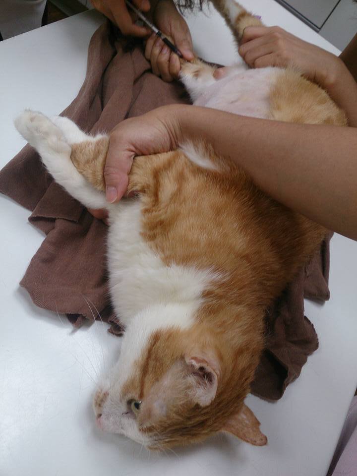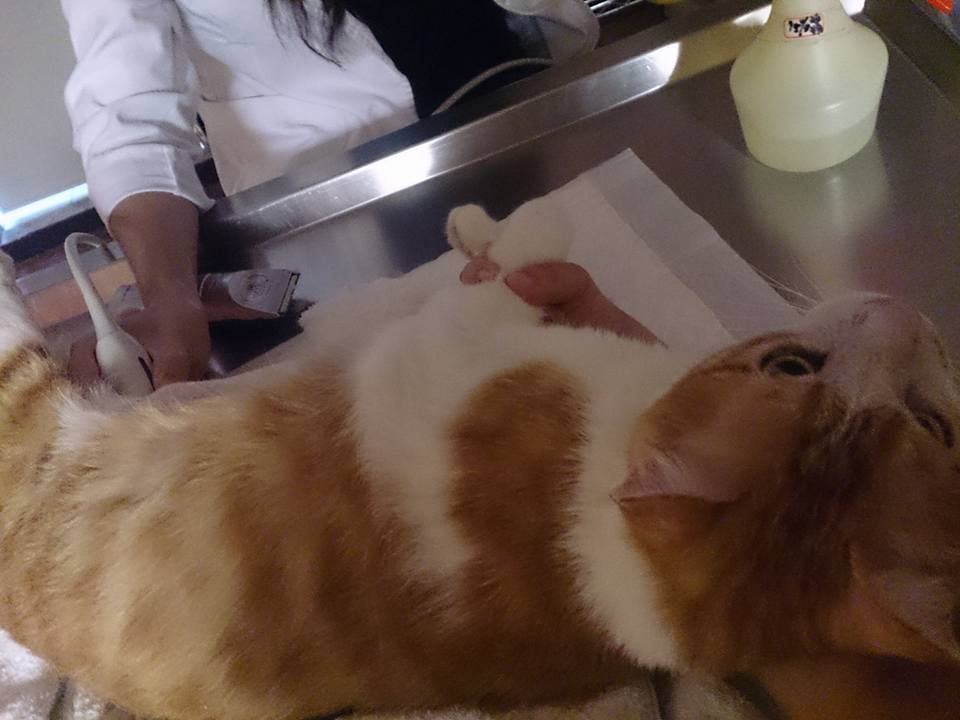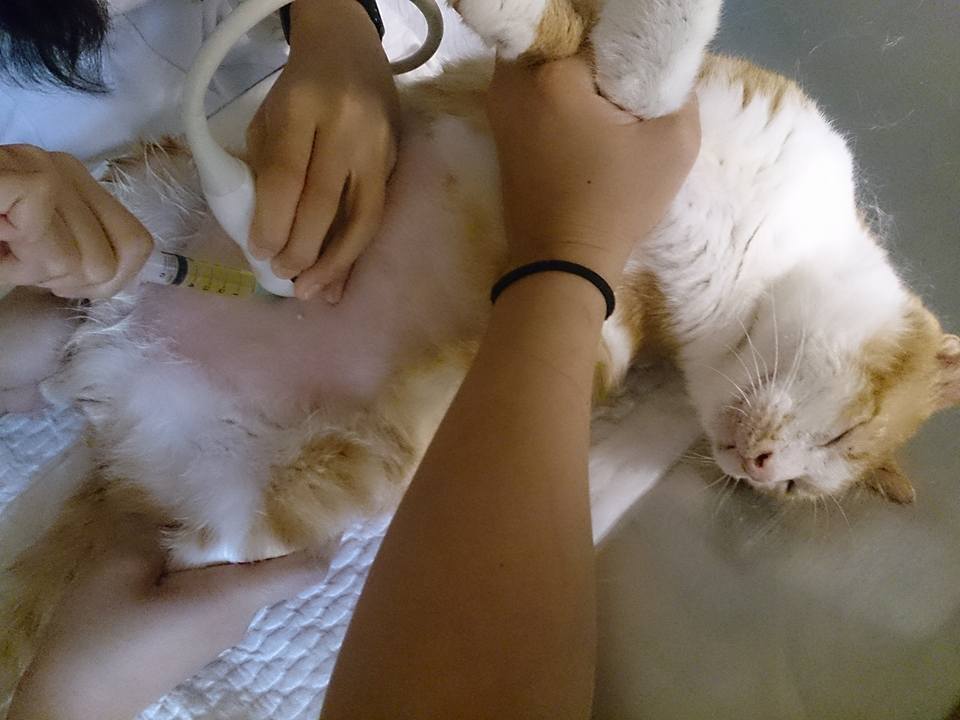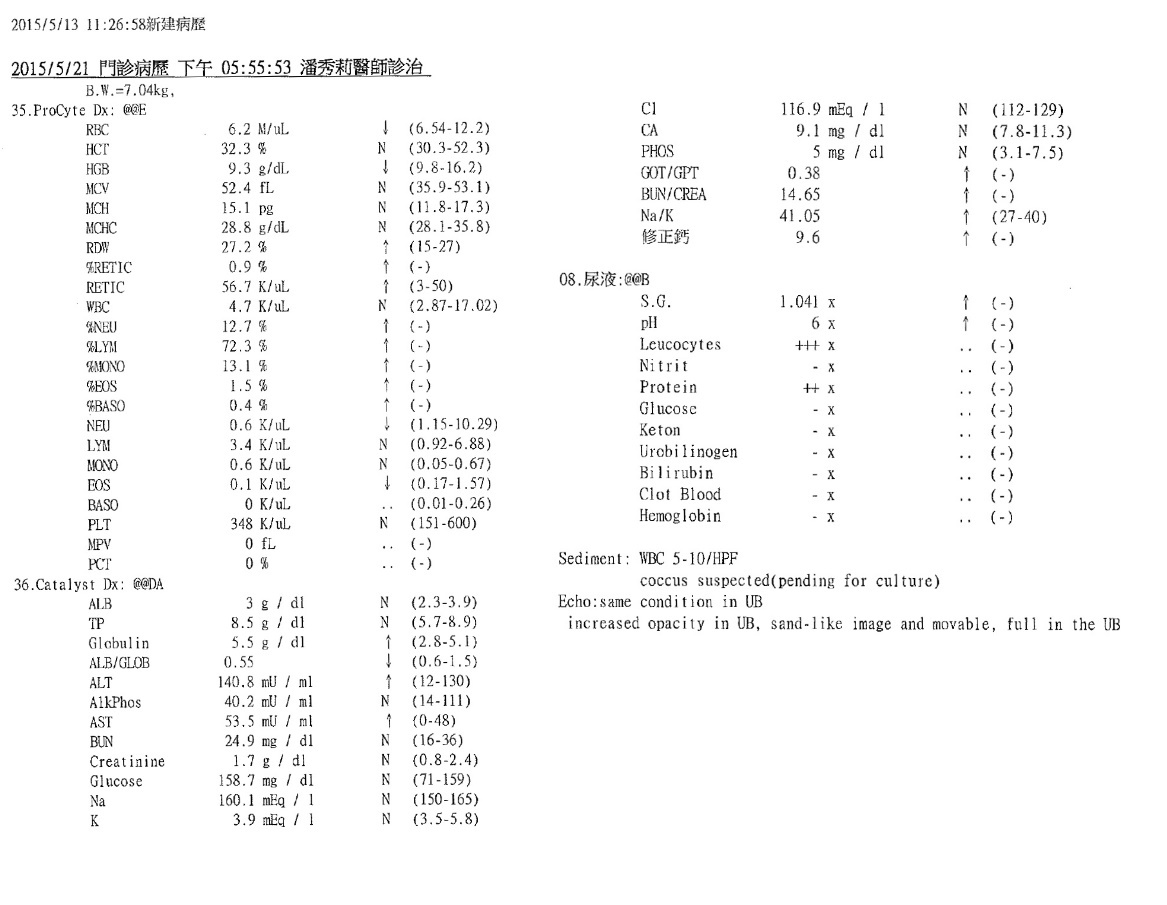 志明已經變得白白胖胖肥肥嫩嫩,有6.8公斤的巨大體型,雖然他的雙腳斷肢因為摩擦有厚厚的繭,在室內還是鋪了厚紙板讓志明行走更加舒服,2015/3月起照顧員發現志明排尿似乎有點困難在砂盆裡蹲很久,送醫檢查,採尿送檢,尿中有草酸鈣結晶,醫生建議要吃泌尿道處方,並給予利尿通幫助,經過兩個月狀況反反覆覆,5/13再次進行超音波檢查,發現膀胱依舊有很多雜質陰影變大,肝指數較高,X光上沒有明顯結石,抽尿液送驗,先給予口服抗生素和膀胱鬆弛劑並每天打水希望藉此將雜質隨尿液排出,還需持續回診,這階段的醫療費用還請各位幫忙。