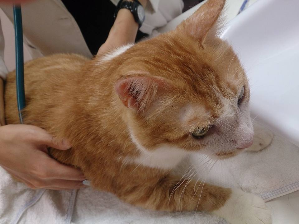 協會粉絲團有人通報苗栗公館一隻狀況非常糟糕的浪喵,照片看來有一條腿已截肢...該區志工立刻前往誘捕,趕到現場並未發現該貓咪蹤影,連續幾天守候終於抓到,立刻送台北協會配合醫院檢查,發現雙後腿都已經截肢,是經過醫療處理過的,卻沒有結紮被野放任他在外自生自滅,還有輕微的鼻氣管炎,在醫院大吃罐頭,抽血檢驗都很配合,雖然有點鼻氣管炎,眼睛紅腫淚眼汪汪,但還是努力在進食,很遺憾愛滋篩檢結果為陽性,免疫力較一般貓差,感冒治癒後進行結紮並洗牙拔牙治療牙齦炎,術後帶回安養之家照顧,2014/6/4至今