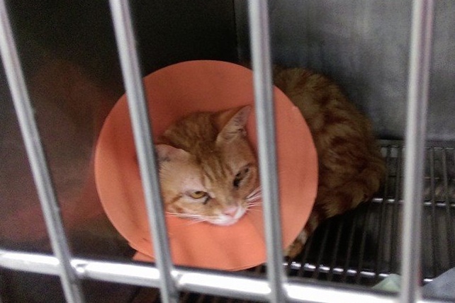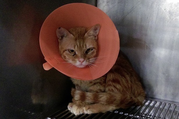 這隻橘子貓"柑仔"在術後出現鼻氣管炎的現象鼻子吹泡泡,眼睛分泌物多,仰頭呼吸很辛苦的樣子,原本結紮的醫院術後休養貓咪眾多,為避免交互感染先行轉院置員山動物醫院治療鼻器管炎,住院前三天貓咪不肯進食又緊張,給與點滴注射補充水分,抗生素針劑和噴霧治療五天後狀況漸緩願意自己進食,將口服藥加入罐頭中餵食,投藥兩周狀況穩定停要觀察,精神食慾胃口良好,以由志工協助R回,醫療費用還請各位幫忙。