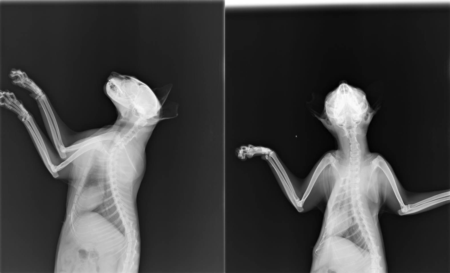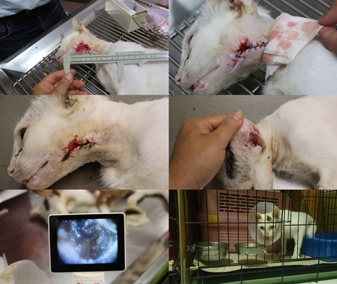 7/10照X光確認無異物卡在傷口深處,詳細檢查傷口後,是深處之流膿未清除乾淨,另外傷貓耳疥感染嚴重,認為傷口應為自行抓傷非外力造成,因重複抓傷造成感染膿腫,進行情創及局部縫合,並且施打治療耳疥針