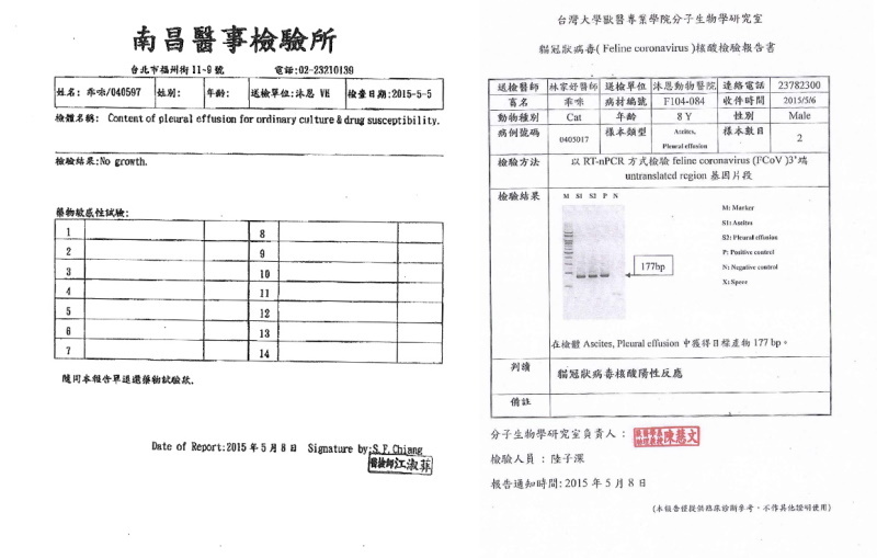 醫生觸診懷疑腹部有積水,照了超音波後確定有腹水,並抽取一管送驗、並做了血檢,已先拿幾日口服抗生素投藥,待化驗結果出爐才能做進一步的治療,這部分醫療費用由李姐支付,5/2轉院至協會配合動物醫院進行更詳細的檢查,血檢白血球3萬8,有感染的狀況,超音波檢查腹腔有腹水,檢驗膽汁酸排除肝門脈分流的問題,看診完李姐將貓咪帶回照顧,一方面可以多陪陪貓,一方面可以節省醫療費用,兩天後回診胸腹水產生速度很快,貓咪呼吸變得比較急促,鎮靜抽腹水,以期能減輕不適,並將腹水送冠狀病毒檢驗及細菌培養,先取藥一周,5/8日檢驗報告灌狀病毒核酸陽性反應,李姐的內心也很糾結,病程表現並沒有很符合一般冠狀病毒發病,且不排除同時有別的問題腫瘤與肝衰竭,醫師認為是腫瘤與冠狀病毒同時發病,目前精神食慾穩定但因為胸腹水目前出來的速度算快,預計每週都需要麻醉抽胸水,這會是比較大的醫療費用,該繼續治療還是放手,看著乖咪持續服用藥物還能夠大口大口吃飼料罐頭,又捨不得一輩子在外流離失所,終於在老年得到一個家的乖咪,就這樣離開,選擇持續治療讓這老孩子可以終老,每周固定回診拿藥抽胸腹水,乖咪過了兩個月的快樂日子,6/25日乖咪出現嚴重貧血狀況,醫師懷疑可能是腫瘤破裂導致出血,建議輸血爭取時間治療,在很臨時的情況下找到幾個熱心貓有的幫忙,順利配對為乖咪輸血,很可惜最後乖咪還是沒有度過,但這兩個月可能是他一生中最能安心睡覺的時候,不用躲避野狗追咬還有人類的驅趕,有吃不完的乾乾還有罐頭,不用日曬雨淋,還有他最愛的媽媽陪在身邊,這一生足以,李姐送走了乖咪,負擔了最後一程火化費用,已經負擔很重,一隻被好好照顧的街貓能夠享壽10年,這中間一定是付出很多心力,惟有細心觀察下才知道乖咪的變化,能及時陪伴他最後一段,李姐餵養的貓都很親他,很多傷病老殘貓都帶回照顧安置,家中也是大爆滿的狀況,每天在外辛苦餵貓,兼差賺錢多買一些飼料罐頭,就是希望這些毛孩子能吃飽一點能度過寒冬,有體力躲避危險,沉重的負擔還希望各位能夠幫忙乖咪。