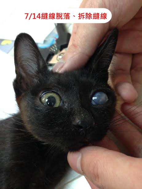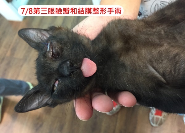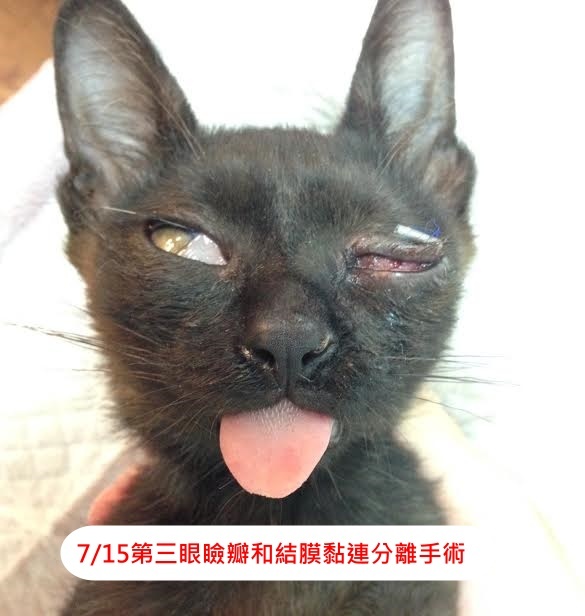 主題: 黑傑克第三眼瞼縫合及結膜黏連手術 申請者姓名: 臺北市支持流浪貓絕育計劃協會 花色: 申請日期: 2015-07-17 19:49:52 申請者部落格: 申請者臉書網址: 所在縣市/合作醫院: 台北市/極光動物醫院 治療費用: 8865元 需求人數: 10人 已結案 (2022-05-13 15:09:14) 報名人員: ERic YU(已付款)、cafeyi(已付款)、Kathleen(已付款)、惠青(已付款)、Patrick x3(已付款)、高小玉(已付款)、amber x2(已付款)、 候補人員: 動物病情說明: 貢寮帶回嚴重鼻氣管炎眼睛凸出的的小貓,在鼻氣管炎狀況穩定後已帶回安養之家照顧,7/8日眼睛明顯比一開始回來的時候更凸更紅,到眼睛專科就診,眼睛只剩薄薄的細胞保護,若受到壓力會穿孔眼球內容物會脫出,眼睛尚有視力,醫生先手術將第三眼瞼縫合保護眼球,日後再打開查看眼睛狀況進行手術,7/15回診發現上次縫合處的線有點鬆脫,所以暫時先拆除,眼睛恢復狀況比預期好,做第二次手術將第三眼瞼縫合及結膜眼黏連分離,希望眼睛狀況會越來越好,醫療費用還請各位幫忙。