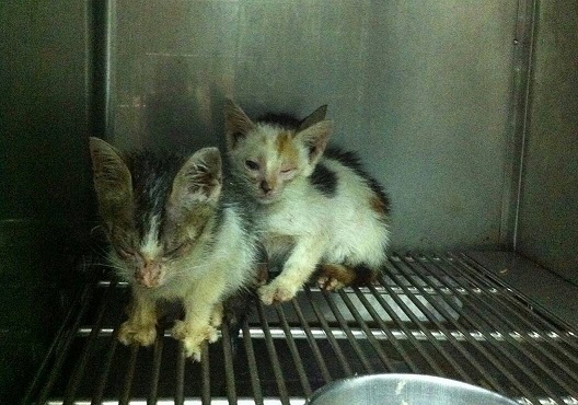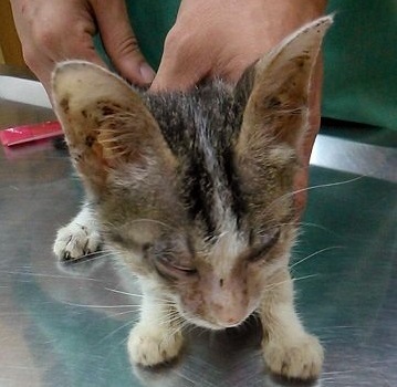 7/27 緊急送醫治療,醫生認為:「小貓罹患貓鼻氣管炎」,並且小貓眼睛均有發炎感染現象,白耳(白底虎斑) 及襪襪(小虎斑)另有黴菌及脫水情形,且糞便檢驗有蟲卵,身體都有跳蚤,經過醫生緊急處理點眼藥水、打針治療及打營養針,當天也做了驅蟲及除蚤,三隻小貓皆住院治療。