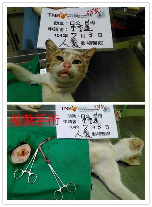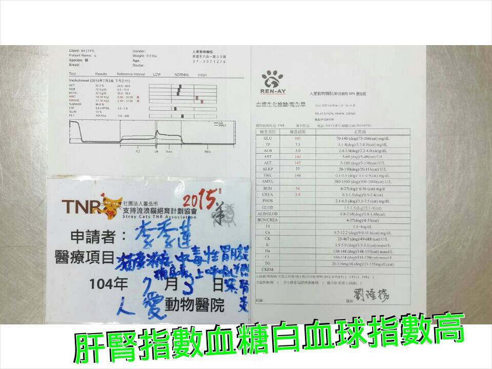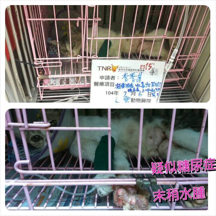 7/3送往人愛動物醫院後在誘捕籠內準備節育手術時就嚴重腹瀉,外觀呈四級左右泥便味道腥臭,鎮定後劉院長進一步檢查,口角流涎,上呼吸道感染,掌爪斷裂出血,懷疑是中毒現象,進一步做生化與CBC二合一血檢,結果顯示:白血球上升非貓瘟是炎症反應,肝腎指數上升為中毒性腸炎,高血糖,口角炎上呼吸道感染二合一快篩結果陽性為愛滋貓,建議結紮住院期間一併注射點滴治療!隨即向協會通報申請醫助