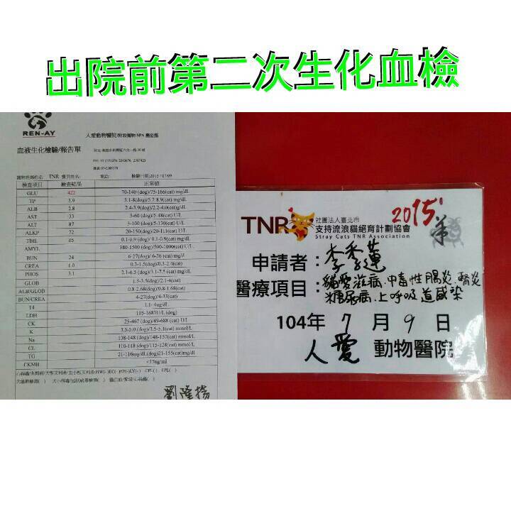 7/9住院第七天可拆線,我要求再做一次血檢由我自付此費用,確保媽媽恢復情況再決定繼續留院治療或原放,血檢結果血糖為421為糖尿貓,其餘肝腎發炎指數皆恢復正常!院長建議精神食慾佳可原放,要餵養人密切注意媽媽飲食要以蛋白質為主,血糖值過高會容易倦怠食慾差,出現這些症狀再誘捕就醫!動物近況說明: 媽媽已原放和二隻幼貓小虎吉吉團聚!和前一胎的小白小橘一起生活在巷弄中,為了穩定媽媽血糖值,我和愛媽將此餵養區改成貓罐罐與無穀飼料!媽媽總是讓前後胎的喵喵們先吃自己才吃,護子的媽媽當初一定也是在趕緊回來照顧幼子的信念下,恢復迅速如期與孩子相聚,看牠們親情互動令我感動,加把勁為更多需要援助的街貓盡力!感謝支持流浪貓TNR協會提供醫助