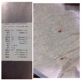 尿中有組織碎片,尿顏色較恢復正常,掃超音波發現右腎構造較不健康,膀胱裡有組織碎片,尿液已送培養檢查有無細菌