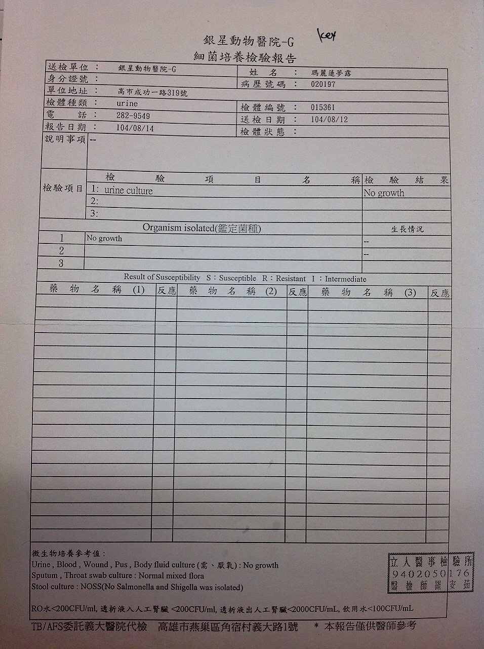 8/15醫生說可以先出院休養,因為十分難餵藥,怕她壓力大又血尿,所以出院時打抗生素治療,8/17尿檢報告出爐,無細菌感染,可喜可賀動物近況說明: 瑪麗蓮夢露出院這幾天狀況都不錯,出院時有打消炎針,這幾天繼續餵口服藥,因為包布餵會大爆走,所以加在罐頭裏,結果整碗都沒吃,以為又怎麼了,倒掉後放乾飼料猛吃。放罐頭加菜,怕被下藥,現在都不敢吃了!哈
