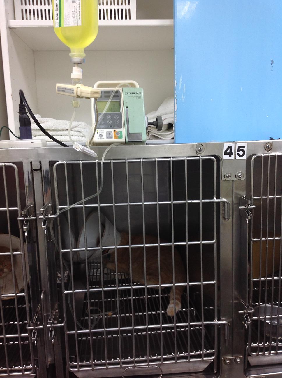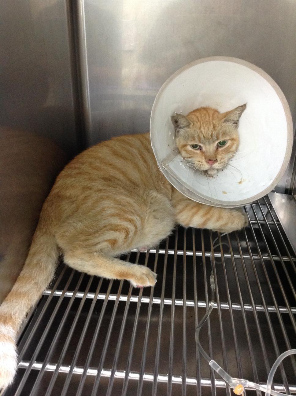 好不容易看到牠從車子底下緩緩爬出來,愛媽見機不可失,回家拿外出籠一舉將牠逮捕,趕緊送往銀星醫院。動物近況說明: 8/19 經醫師檢查.奶茶的外觀有很嚴重的口腔潰瘍、嚴重脫水,低體溫(37.3),血檢有嚴重腎衰竭、肝指數偏高,且有胰臟炎。醫院給予奶茶靜脈點滴和治療針劑,也一併給予胰臟酵素抑制劑。