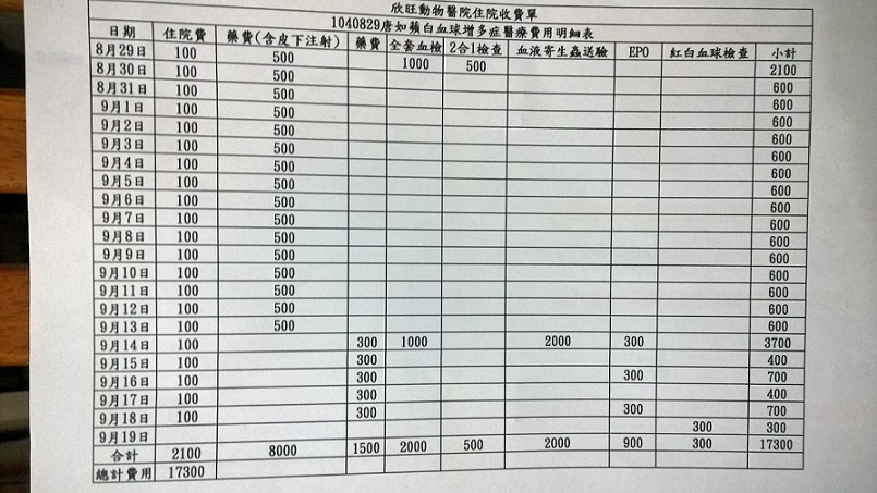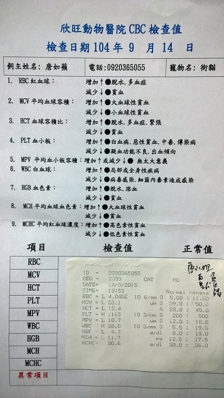 治療16天後貓咪白血球指數從59.9降至38(正常值是5.5-19.5)白血球指數還是很高
