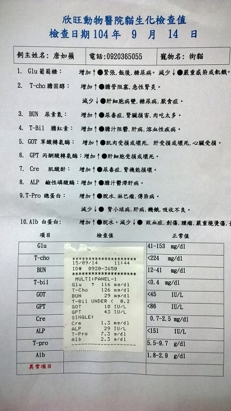 另外生化檢查值也顯示貓咪的腎臟機能是異常