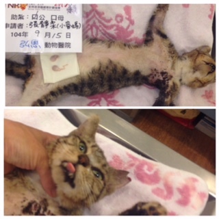 醫生判斷左前肢外傷,嚴重感染,組織壞死,血液檢查結果白血球超高9萬7,嗜中性球9萬,單核球都嚴重超標;血清學檢查,有敗血症引起的高血糖 173;血液氣體分析結果,有混合性酸血症、脫水、鈉離子過高,COMBO檢查 無貓白血病 及 愛滋病;血壓 低於70mm/hg,綜合判斷有低血壓休克 給於強心劑 dobutamine 加強血壓 並增加輸液以增加血液容積;另外因為在外面沒有進食很多天,己有脂肪肝 黃膽 必需用鼻胃管灌食;另外因為高血糖又脫水,給予糖尿病使用的Fructose點滴,初步估計住院7天穩定生命跡象再觀察是否處理傷肢