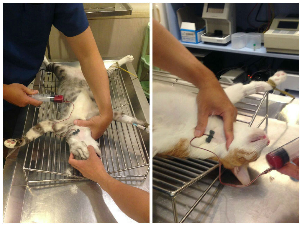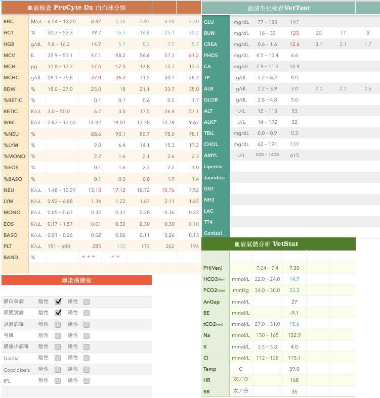 8/28 早上又嘔吐,而且很喘,醫生幫不拉妹做緊急血檢,驗CBC RBC掉到2.97,HCT16.8,HGB5.3,呼吸98,心跳188,體溫39,醫生說可能敗血症造成凝血異常,導致體內不明的出血,醫生叫我趕快找捐血貓,我當天趕快連絡貓友,緊急配對,配對成功,輸血成功,當天晚上血檢RBC恢復中,RBC4.89,HCT提升至25.1,HBG7.7,呼吸52,心跳152,體溫38.5,精神也恢復許多,有好轉的現象。