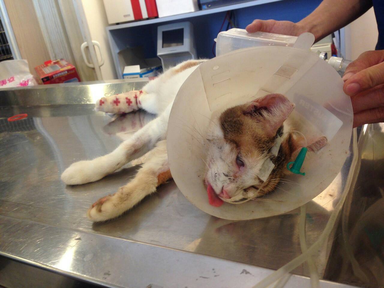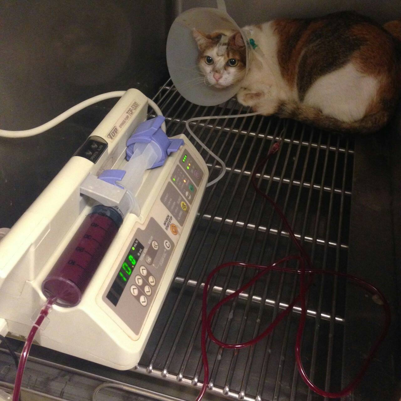 8/31 呼吸88,心跳190,體溫37.9,今天去看不拉妹,早上一樣又變得很喘,醫生做CBC檢查,RBC2.53,HCT16.5,HGB4.8,表示紅血球又急速的下降,醫生說又造成又一次的急性的貧血...。血小板也低於正常值147,點滴換腳,血檢BUN34,CREA2.8,因敗血症的關係,併發症又高起來,治療,除了泰寧之外,再另增加(Augmentin)抗生素合併使用,醫生叫我趕快找捐血貓,需要緊急輸血,後來在貓友的幫忙下,找了寶寶