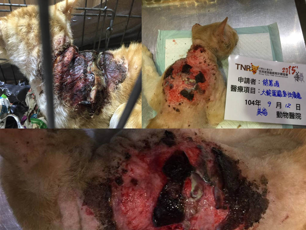 9月12日送醫後,醫生緊急處理傷口,傷口整片已經潰爛發臭且一直流出血水和膿,清創傷口後發現受傷的部分已經爛到皮膚下深處了,所以也為貓咪注射長效型的抗生素,配合吃藥擦藥,然後觀察傷口的癒合狀況。