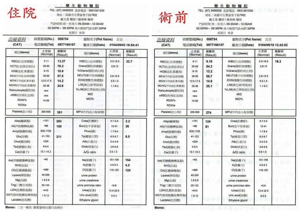 9/14去看吉吉術後持續恢復中,食慾也不錯,9/25去醫院看吉吉原定吉吉出院日,但因中秋連續假期跟颱風天,怕放炮聲會嚇到吉吉,因此自費讓吉吉住到9/30。