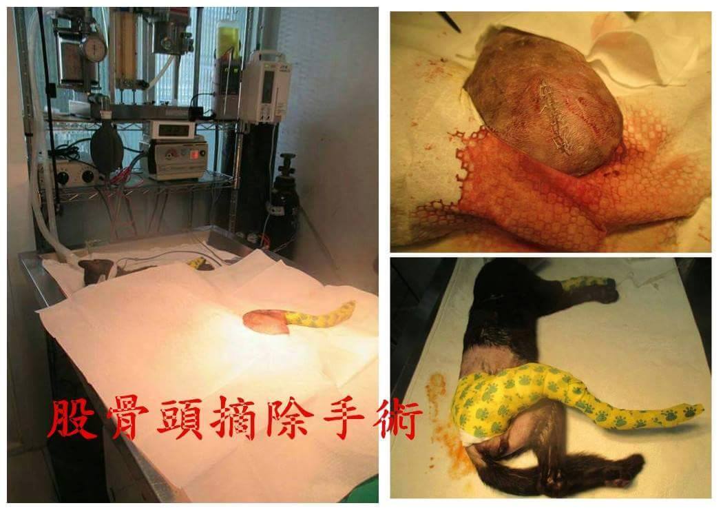 吉吉身上有輕微外傷但有脫水及眼鼻分泌物,初步驗血發現肝指數及白血球都有偏高,有發炎現象,貓二合一檢驗都為陰性,後腳經X光檢查發現有右側骨盆骨折,造成股骨頭及骨盆內凹,促使骨盆直腸通道變小,有可能會造成日後排便問題且內凹的股骨頭會造成疼痛及行走受限,建議股骨頭切除,目前已先點滴及給藥治療,後續如狀況穩定後才考慮進行手術。