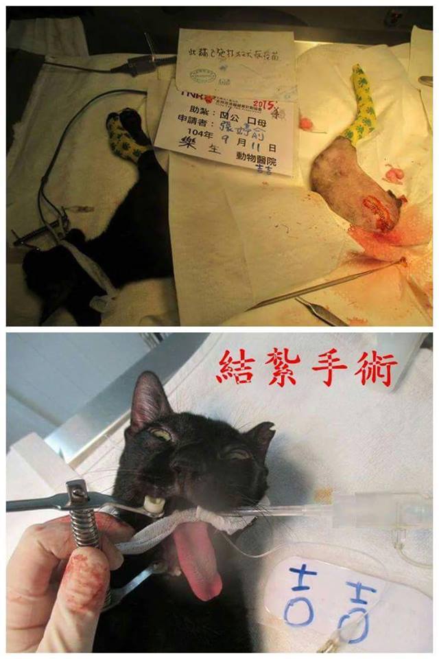 在舊家餵養區的吉吉有兩天沒有出現,9/2晚上餵食看到吉吉時,發現後腳跛腳非常嚴重,走路呈半跳狀態 不吃 腹部似乎有傷口,由於吉吉一直躲在車子底下中央,大概很不舒服,等了一段時間,一直不出來,於是9/3凌晨繼續進行誘捕,抓到後早上送至樂生動物醫院,一起順便結紮,醫生診斷如下。