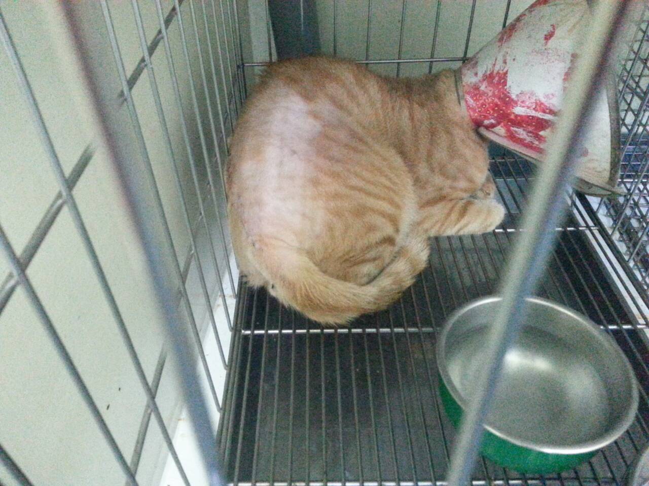 連續一週的加班,遲遲無法前往探視橘貓,今天提早下班過去看他,傷口已經好一大半了,雖然仍有部分結痂,但至少已經不再流血水,而且食慾一直都很不錯,我想這一兩天即可出院了。