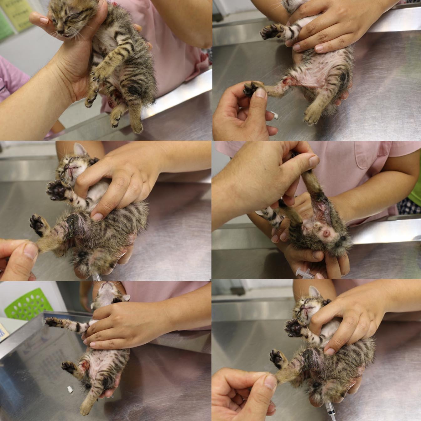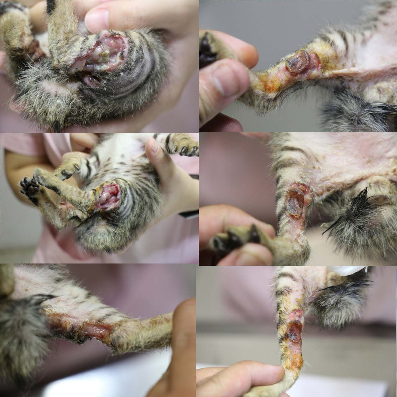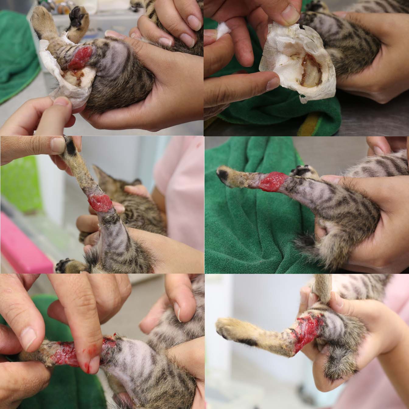 9/16眼部已無流眼水及眼膏,雙眼清明,且胃口不錯(一餐可自行食用30顆幼貓飼料,一天約食7餐),順利排大便1次及尿水1次.左後腳腐臭味減少且呈現粉紅出水嫩肉,傷口開口處看得見骨頭及部份粉紅肉組織,右腳開始有大塊結疤硬塊.今日左後腳開始做清創敷藥包紮(開始要為期兩週的清創,每2日清創一次,視清創狀況,之後再進行縫合),右後腳給予藥劑自行擦拭,今日開消炎藥3日份(內含驅蟲藥),護士建議可開始使用貓砂.