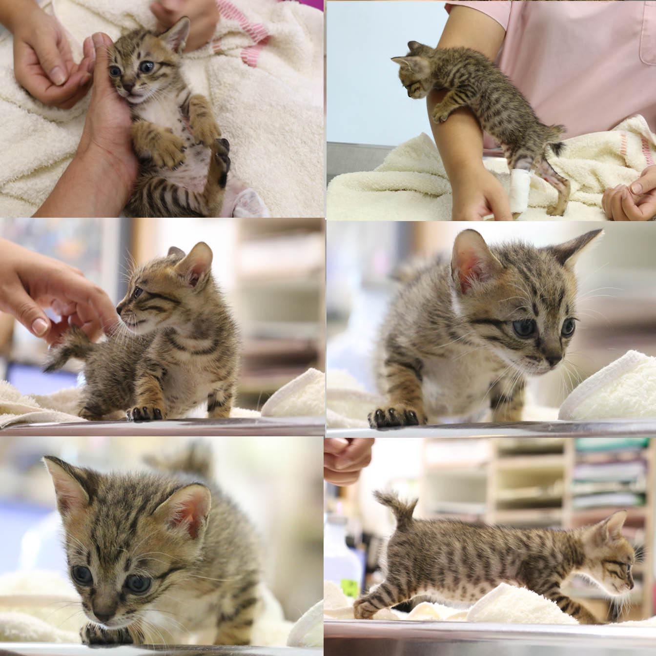 9/27左後腳敷藥紗布取下,傷口血紅肌理組織部份明顯縮小,外圍開時長出皮,繼續塗幫助肉芽生長的藥劑包紮,右腳小結疤,已可開始不用擦藥讓其自行癒合;一餐可自行食用40顆幼貓飼料,因出現愛咬東西的狀況,嘗試食用未泡水的幼貓飼料一餐可食用15~18顆硬,22~25顆半軟飼料,另補充一些水,一天約食7餐,順利排大便4次(排便為淡黃條狀)及尿水3次.已可自離地約30cm高跳上跳下玩耍.