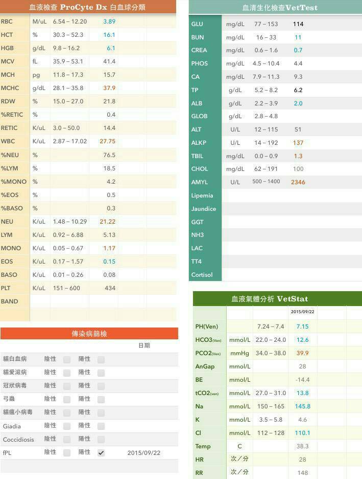 白血球、NEU中性㺷、mono 單核球、band核左転、是典型的敗血症、醫生說明了一堆,ALKP肝指數、TBIL瞻、AMYL 胰指數圴飆高,肝瞻胰均發炎、腫脹∼是貓的三聯體症,另外血液氣體分析∼因為敗血症引起代謝性的酸血症。還有Na鈉せCl氯過低∼吐拉造成的電解質不平,醫生說綜合以上判斷,貓已經有敗血性休克,隨時有生命危險。醫生首先、調整血液酸鹼質、電解質、打強心針、維持血壓,醫生很努力 但貓咪掃超音波雙側腎臟都有萎縮且血流量少,有腎衰竭,之後又併發感染及胰臟炎導致食慾廢絕,脫水,低白蛋白,最後因多重器官衰竭去當天使去了,感謝所有關心他的朋友,醫生和貓咪都盡力了,也感謝大家捐款幫助了貓咪走完最後一程,謝謝^^