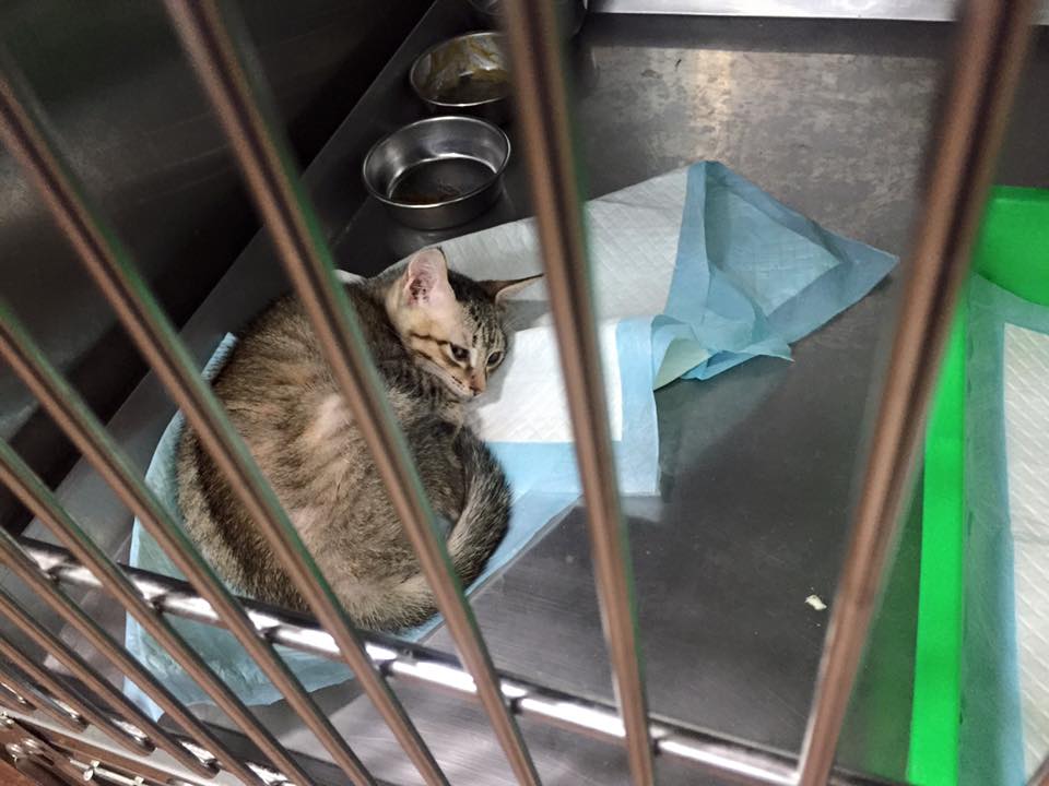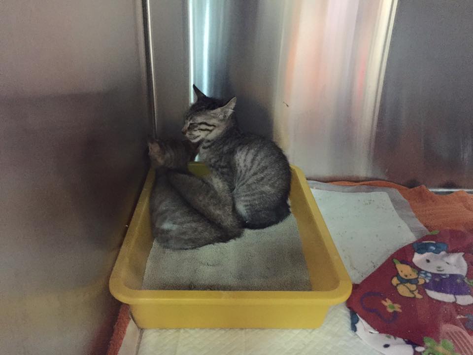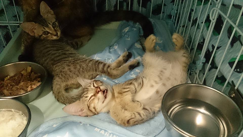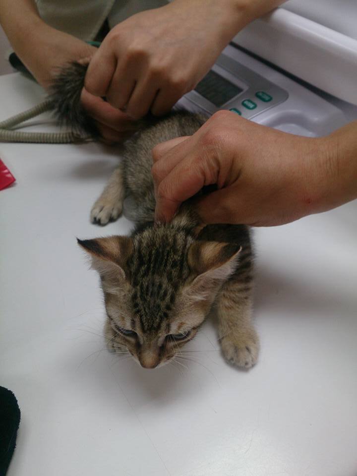 志工前去救援,發現貓咪非常親人,抱進外出籠送醫檢查,x光檢查發現腹腔赫尼亞,胎兒隨著破洞掉到後腳,當天血檢白血球過高,恐怕已經有感染的狀況,萬一引發腹膜炎,會危及母子的性命,緊急安排手術,腹中的胎兒只能盡力保全,希望母貓能平安,隔日手術縫合腹腔破洞,並將小孩取出,共有六隻,因為由腹腔掉出,有兩三隻小貓活動力較差,母貓清醒後因為腹腔壓力改變,感到非常不舒服,也有可能因為沒有生產的過程,他不願意接近小貓,一看到人就倒地討摸摸的她,拒絕小貓靠近,也不願意哺乳,醫師緊急通知由志工帶回人工餵奶,每隻小奶貓都比正常奶貓小了三之一,活動力較差懶洋洋的,志工每三十分鐘一兩滴奶水餵養,慢慢的其中三隻小貓越來越有活力,但另外三個小朋友飛走了,我們都盡力了,也謝謝志工幫忙找尋已經哺乳結束的貓媽媽,經過檢驗隔離確認身體狀況良好,擔任起三小貓的哺乳的重責大任,玳瑁媽媽雖然有點小緊張,疑惑的看著小奶貓,夜深人靜,充滿愛心的她開始認真當起奶媽的角色...