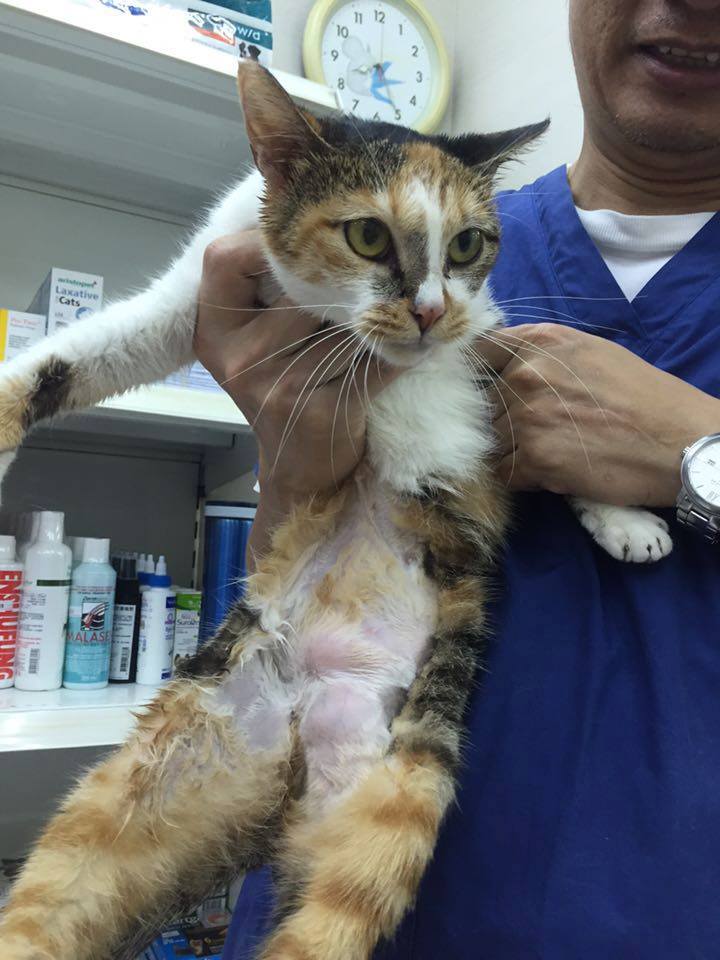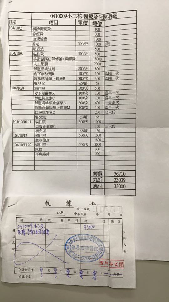而在醫院先是觸診,隨後也做了X光、超音波檢查,看完了詳細的報告後,醫生建議開腹後才能更加清楚疝氣的嚴重程度,因此安排住院動刀,小三花在手術過後我也將接手照顧她的後半輩子,絕不會再讓她回到街上。動物近況說明: 小三花於手術後再醫院觀察了3週,確認穩定後已將她接回家照顧,目前與家中原有貓咪相處良好。