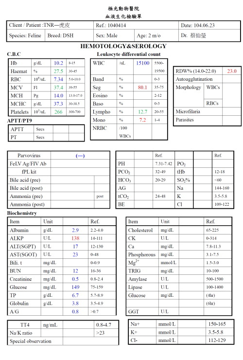 主題: 鼻氣管炎的虎皮 申請者姓名: 臺北市支持流浪貓絕育計劃協會 花色: 申請日期: 2015-10-07 10:10:46 申請者部落格: 申請者臉書網址: 所在縣市/合作醫院: 台北市/極光動物醫院 治療費用: 6939元 需求人數: 15人 已結案 (2022-05-13 15:12:11) 報名人員: Angus Chuang、Angus Chuang(已付款)、心純意正管理顧問有限公司 x14(已付款)、 候補人員: 動物病情說明: 虎皮的媽媽是志工從收容帶出的喵喵,當時大腹便便,不忍引產,在醫院待產後生下4個小孩,隔離後帶回安養之家由黑媽媽繼續照顧哺乳,因為天氣化大,黑媽媽和虎皮黑皮開始出現感冒症狀,而虎皮感覺倦倦的有作噁想吐的動作,一直跑砂盆卻只有拉出一點點,感覺腹部不舒服,一直唉唉叫,送醫檢查,為謹慎起見,做血檢和貓瘟試劑,所幸白球正常、貓瘟檢驗也是陰性,糞檢有消化不良的狀況,沒有明顯的鼻水,輕微發燒,擔心狀況會越來越嚴重,先留院治療,晚上開始淚水增多,眼睛紅腫、鼻塞不願意進食,早晚噴霧,虎皮很快就恢復食慾,看他大口大口吃著泥狀罐頭,而黑皮卻仰著頭看起來很不舒服,一周後虎皮狀況較為穩定,已先帶回安養之家照顧,而黑皮因為還是不願意自己進食,繼續留院治療,黑皮、虎皮眼睛有泡疹病毒感染,需要使用專用價格較昂貴專門抑制病毒的眼藥水,照顧上食物內必須添加消化酵素等營養品,配合早晚噴霧,慢慢狀況越來越穩定,也沒有眼淚鼻水,變的頭好壯壯,醫療費用還請各位幫忙。