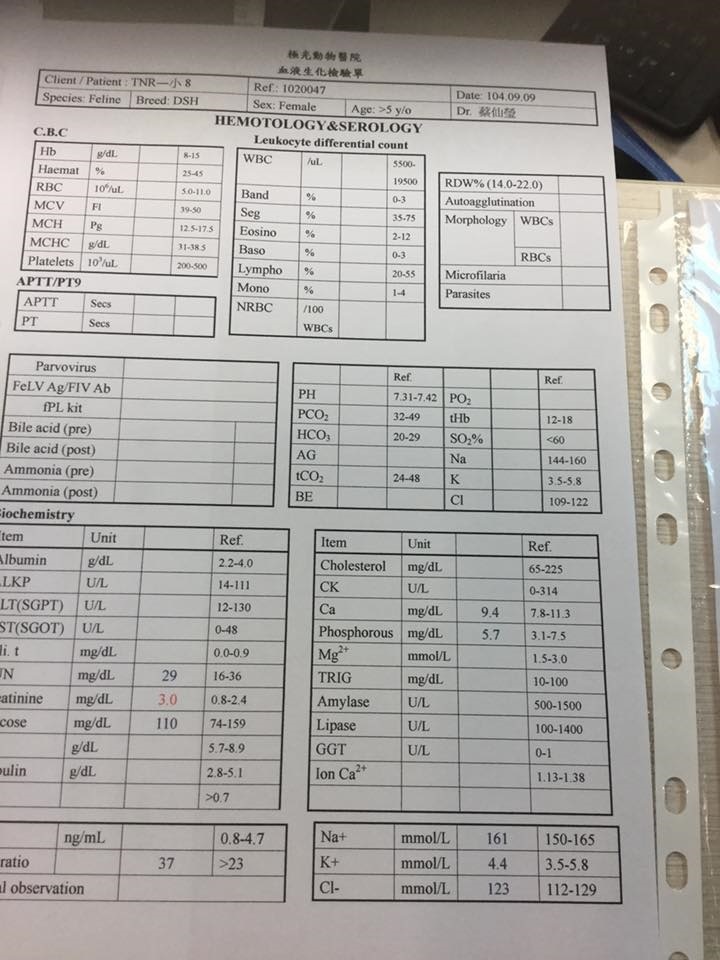主題: 慢性腎衰竭的小八 申請者姓名: 臺北市支持流浪貓絕育計劃協會 花色: 申請日期: 2015-10-07 11:33:26 申請者部落格: 申請者臉書網址: 所在縣市/合作醫院: 台北市/極光動物醫院 治療費用: 4590元 需求人數: 10人 已結案 (2022-05-13 15:12:08) 報名人員: peny(已付款)、Nancy Chai(已付款)、MON(已付款)、侯爺.絲茉茉(已付款)、v_ki(已付款)、lazymimicat(已付款)、心純意正管理顧問有限公司 x4(已付款)、 候補人員: 動物病情說明: 小八是102年2月1日過年前,協會由板橋防疫所救出,當時他被排在第一批安樂名單上,因為小八疑似被車撞擊,下巴顎骨斷裂,無法進食,情況不好,協會將他送到重症醫院治療,手術將下顎接合恢復良好後,再進行第二次外科手術,縫合橫隔膜疝氣(赫尼亞),經過二個月細心照護,由一開始人工灌食,慢慢顎骨癒合,會開始進食半固體食物,再進步到能進食固體食物後,在3月29日,接回協會安置之家,現在也已經兩年多,小八一直都有口炎的問題,但礙於腎指數一直在臨界值,還願意進食的情況下,醫師建議先給予類固醇和抗生素治療,四月小八明顯食慾下降,體重從4公斤下降到3.5公斤,血檢腎指數可能因為口炎進食量下降指數偏高,4/29進行麻醉洗牙、拔齒(九顆),住院治療兩天先帶回安養之家照顧,之後小八的肝腎指數都略高,體重也都維持在3.5公斤左右,每天需要施打皮下林格兒液125CC,指數慢慢下降,肝指數已恢復正常,但腎指數一直在3左右近兩個月觀察還算穩定,小八要加油唷,繼續努力做好花嬸的小跟班,努力變的根花嬸一樣肥嫩唷!三個月醫療費用還請各位幫忙