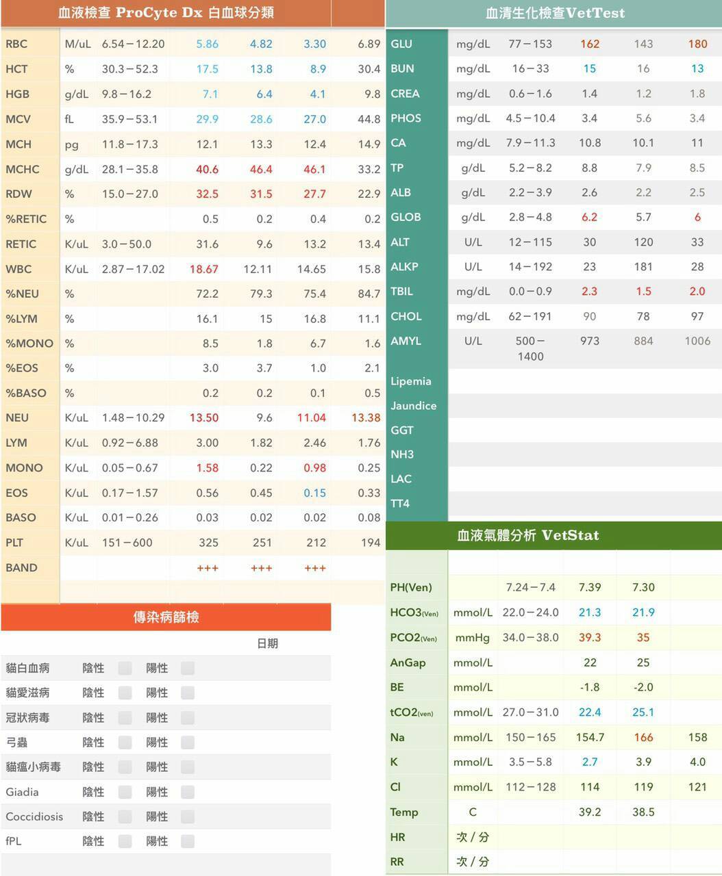 在灌食的處理,初期要預防在灌食症候群,要防止鉀離子失衡鈣離子失調及血糖的變化,醫生有再幫貓咪更換抗生素,如有不慎,反而因為進食而突發死亡的狀況. 這幾天敗血性貧血,要輸血. 沒想要單純以為魚刺解除休養幾天,會發現還有如此多的狀況而且很嚴重。