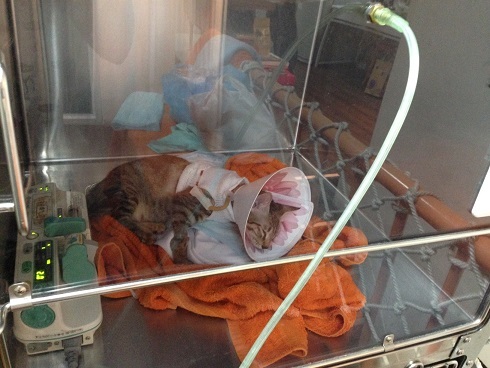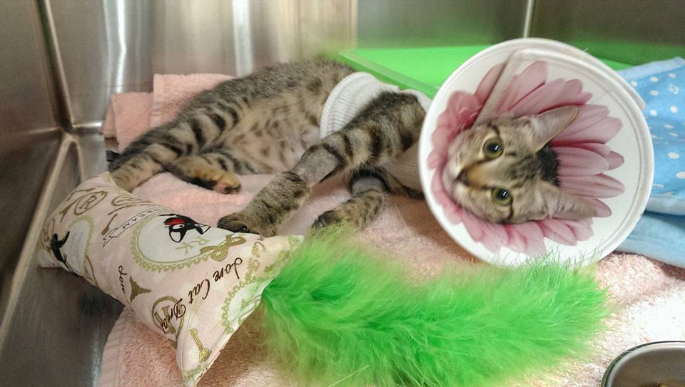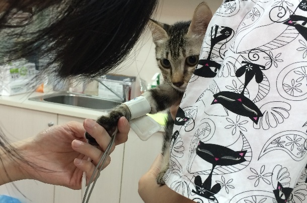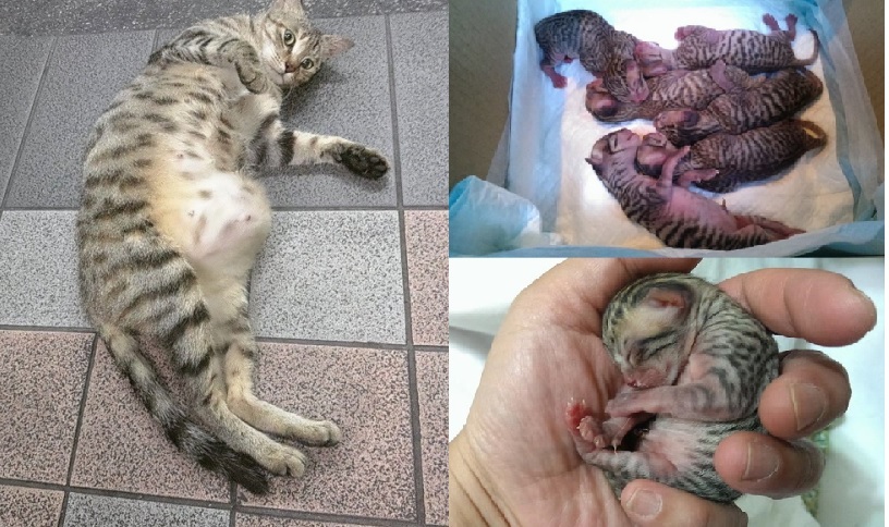 隔日手術縫合腹腔破洞,並將小孩取出,共有六隻,因為由腹腔掉出,有兩三隻小貓活動力較差,