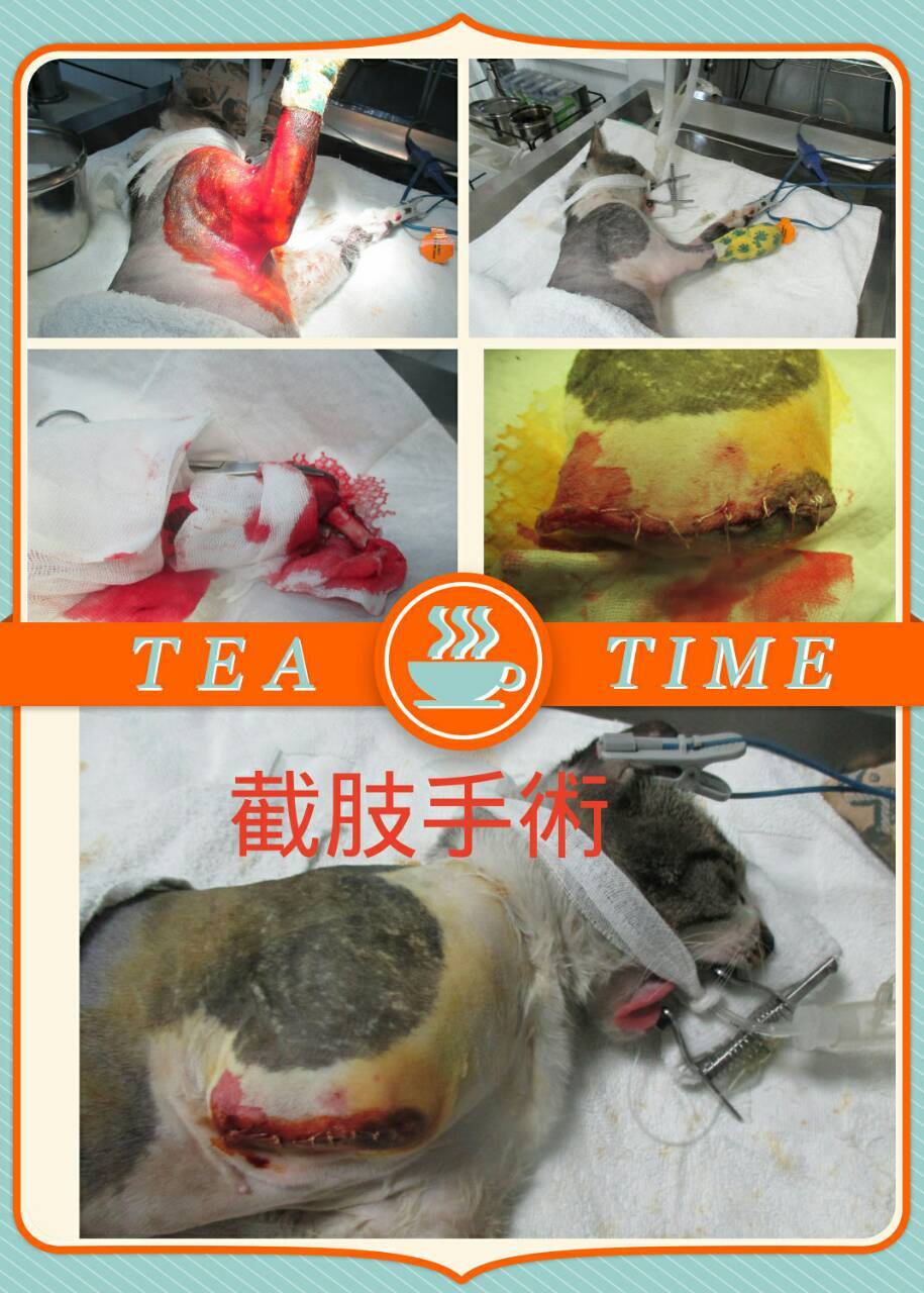 這捕獸夾貓咪送到醫院後,一開始先清創,等貓咪狀況穩定, 再進行截肢前腳掌,腹部有赫尼亞也處理了,原本
