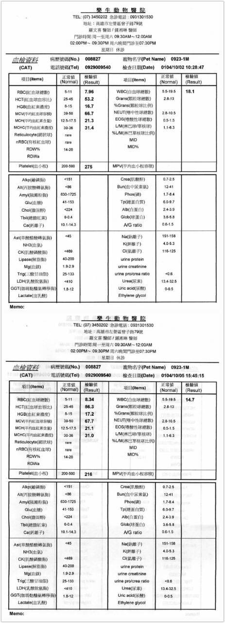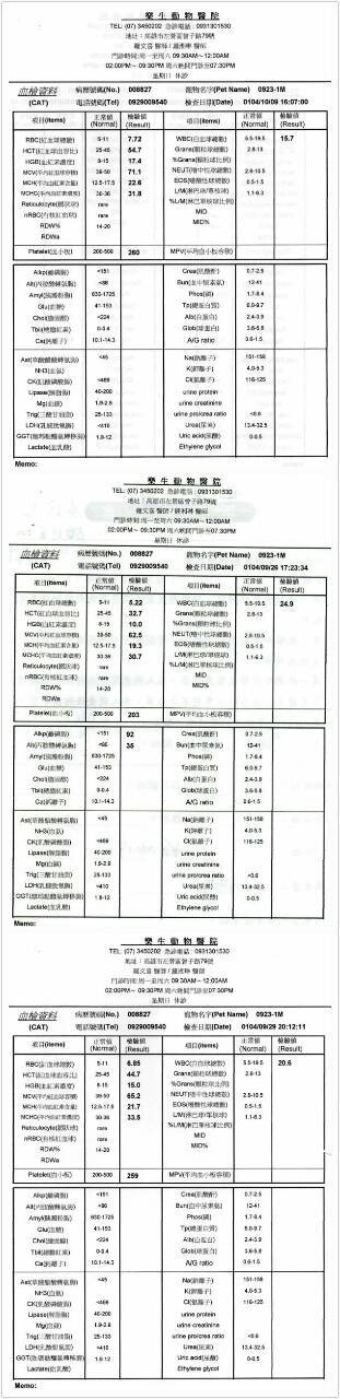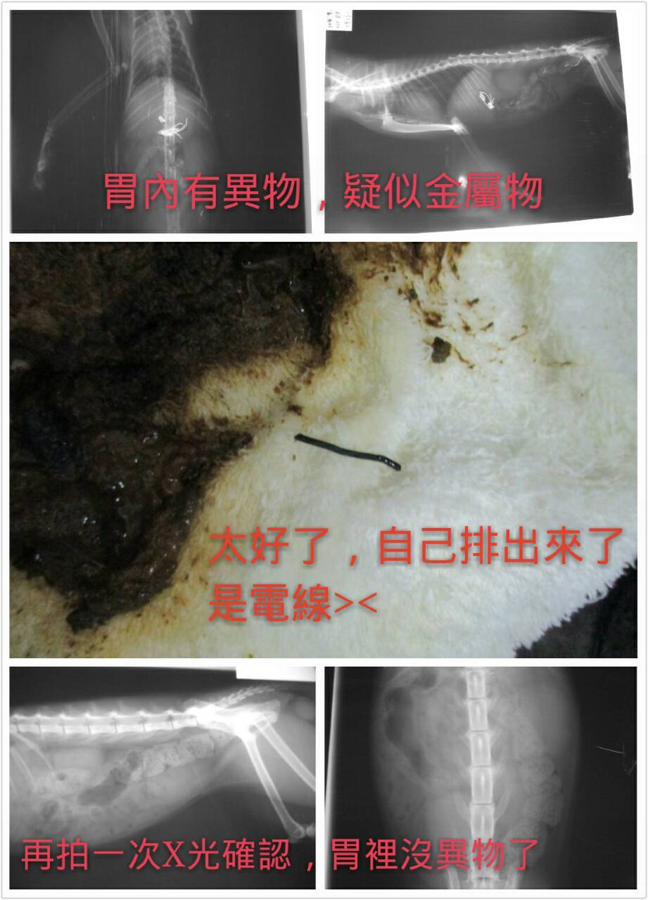 X光發現胃�內有異物(可能是金屬類物質), 因為在貓的大便發現一小段東西排出,確定是電線,再幫貓照了x光發現原本的異物不見了,所以原本預定的腸胃道手術取消。