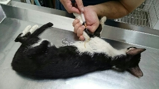 貓咪住院期間完全無法進食,為了維持生命,為貓咪裝上鼻胃管,每天灌食雞肉泥,同時針對貓瘟病情,給與支持性的療法。