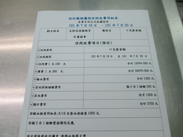 主題: 嚴重口炎爆瘦貓老大 申請者姓名: 楊溫蒂 花色: 申請日期: 2012-07-20 14:48:29 申請者部落格: 申請者臉書網址: 所在縣市/合作醫院: 台北市/欣旺動物醫院 治療費用: 3700元 需求人數: 10人 已結案 (2012-12-01 22:15:56) 報名人員: 蝸牛(已付款)、蝸牛(已付款)、Zoe(已付款)、KO.PON(已付款)、蔡小喵(已付款)、安(已付款)、Yu Ha(已付款)、nana Peng(已付款)、Catling Chang(已付款)、Heng Hui Wang(已付款)、 候補人員: Vivienne Sun、小舟、 動物病情說明: 口炎貓老大是去年8月1日TNR的公貓