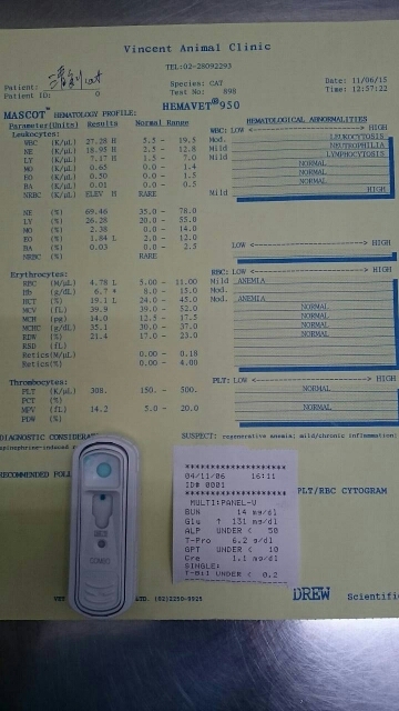 抽血檢查,貓咪二合一呈陰性反應,沒有貓愛滋及白血病。但是嚴重貧血,有敗血現象。