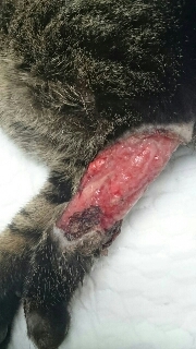 馬上進行清創手術,因為潰爛面積過於龐大,無法縫合,只能每天清創傷口,上敷料,餵食消炎口服藥。