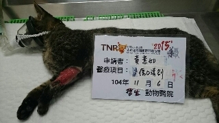 主題: 前腳大面積受傷的虎斑貓 申請者姓名: 黃意如 花色: 申請日期: 2016-01-01 13:11:23 申請者部落格: 申請者臉書網址: 所在縣市/合作醫院: 新北市/哲生動物醫院 治療費用: 23040元 需求人數: 25人 已結案 (2023-01-18 23:36:53) 報名人員: 藍格子(已付款)、張馨蓓 x5(已付款)、陳昱先 x2(已付款)、Mandy Hua(已付款)、咪咪(已付款)、筠珊(已付款)、Annie x2(已付款)、皮皮&米漿(已付款)、alaza(已付款)、Vicky Tseng x2(已付款)、Ivy(已付款)、Lien Lily(已付款)、vivian(已付款)、Noodle、Joe Hook、科二(已付款)、村上喬西 x2(已付款)、luna_lin(已付款)、Eric Chien(已付款)、 候補人員: 動物病情說明: 凌晨的果菜批發市場,發現固定餵養的虎斑家族,一隻貓咪的前腳少了一大塊皮,血紅色的傷口清晰可見。
